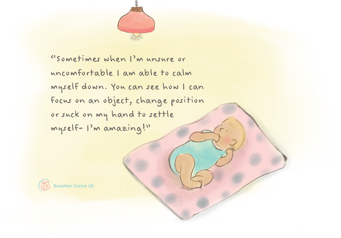 Along with support from you, your baby has amazing inbuilt abilities to help himself/herself stay calm and organised; especially if they are beginning to feel a little overwhelmed from the environment and stimulation around them. Admire how focusing in on an object or the rhythmic suck of their hand calms them.