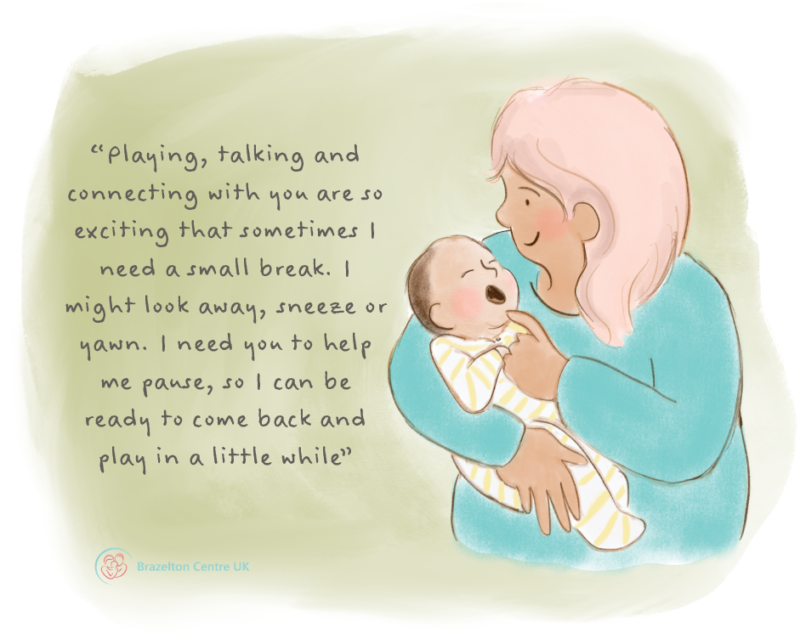 Your baby is so interested in exploring the world, especially through interaction with you, but they can only tolerate so much stimulation. There are many little time-out cues that can signal needing a break like yawning, looking away, sneezing, hiccupping, change in colour or breathing. Allow your baby to renew their energy and help by lowering the level of stimulation before playing again when they show they are ready.
